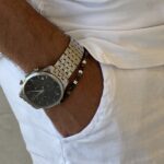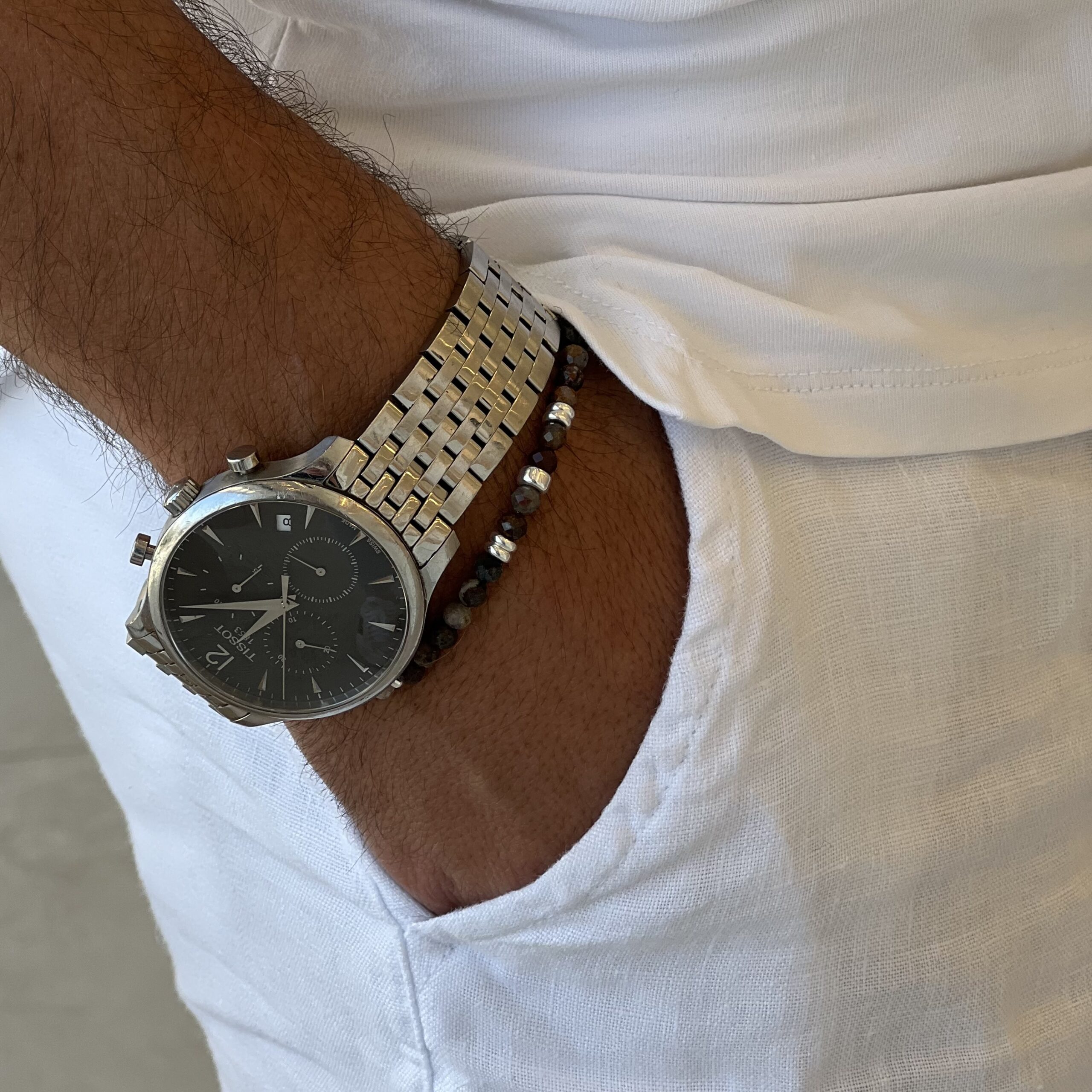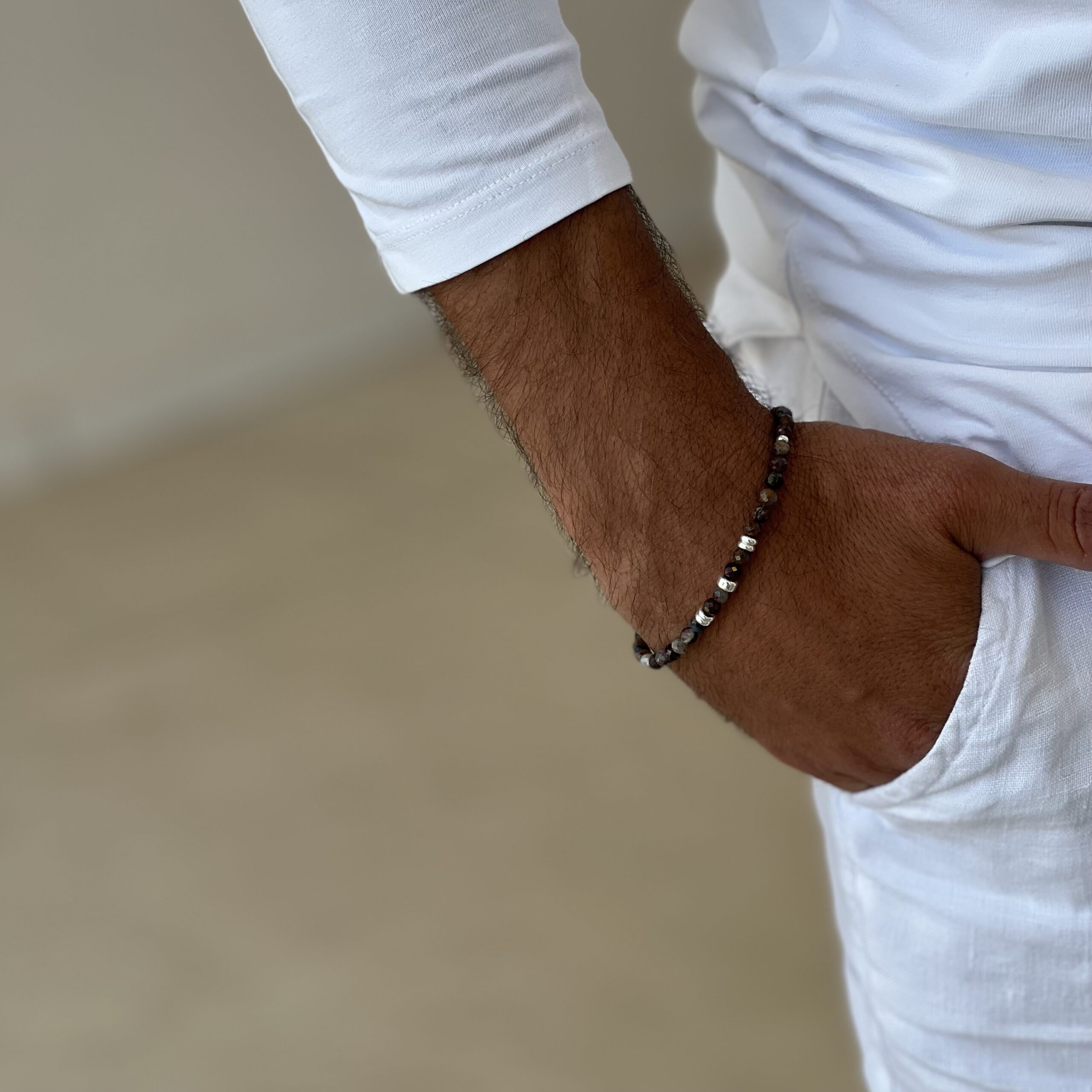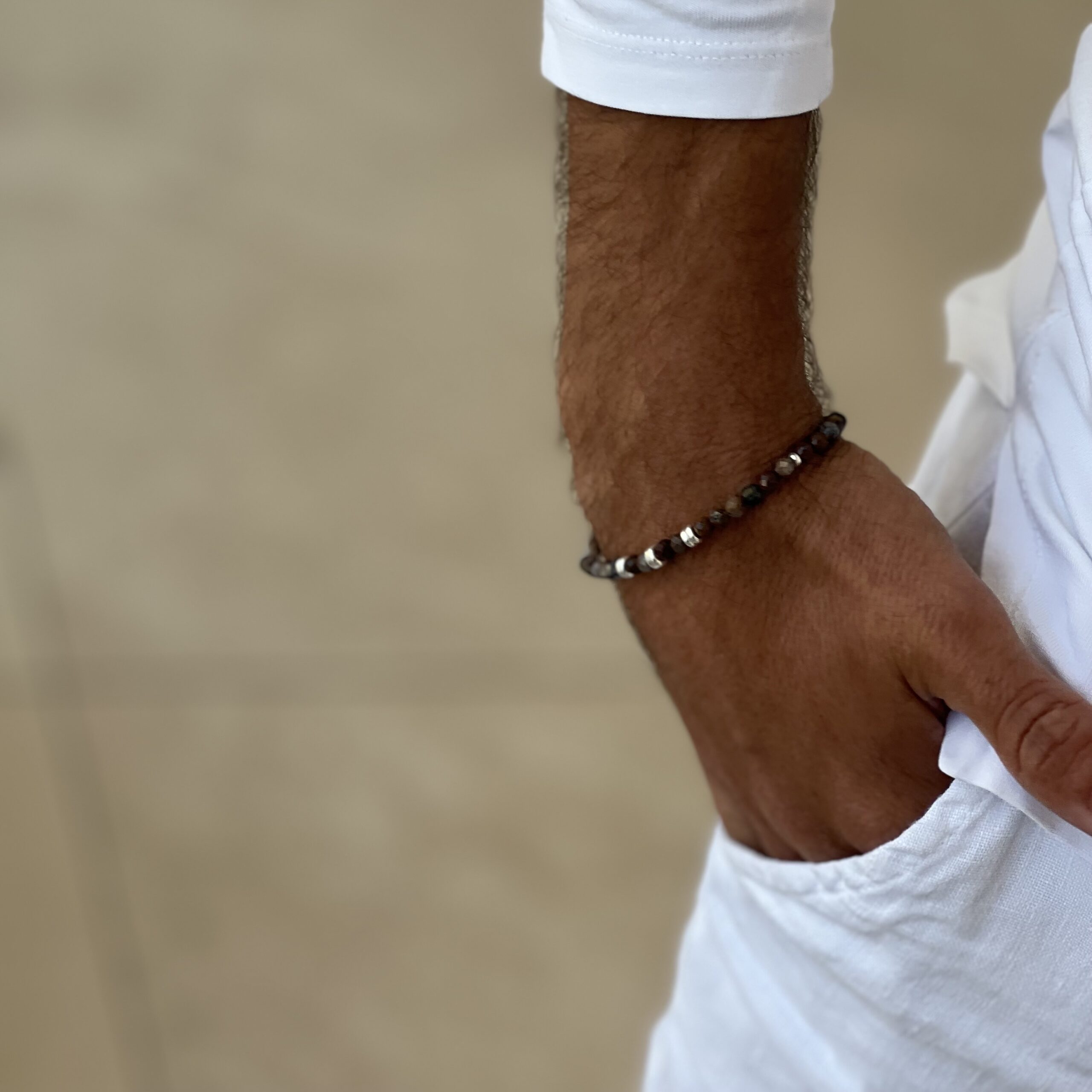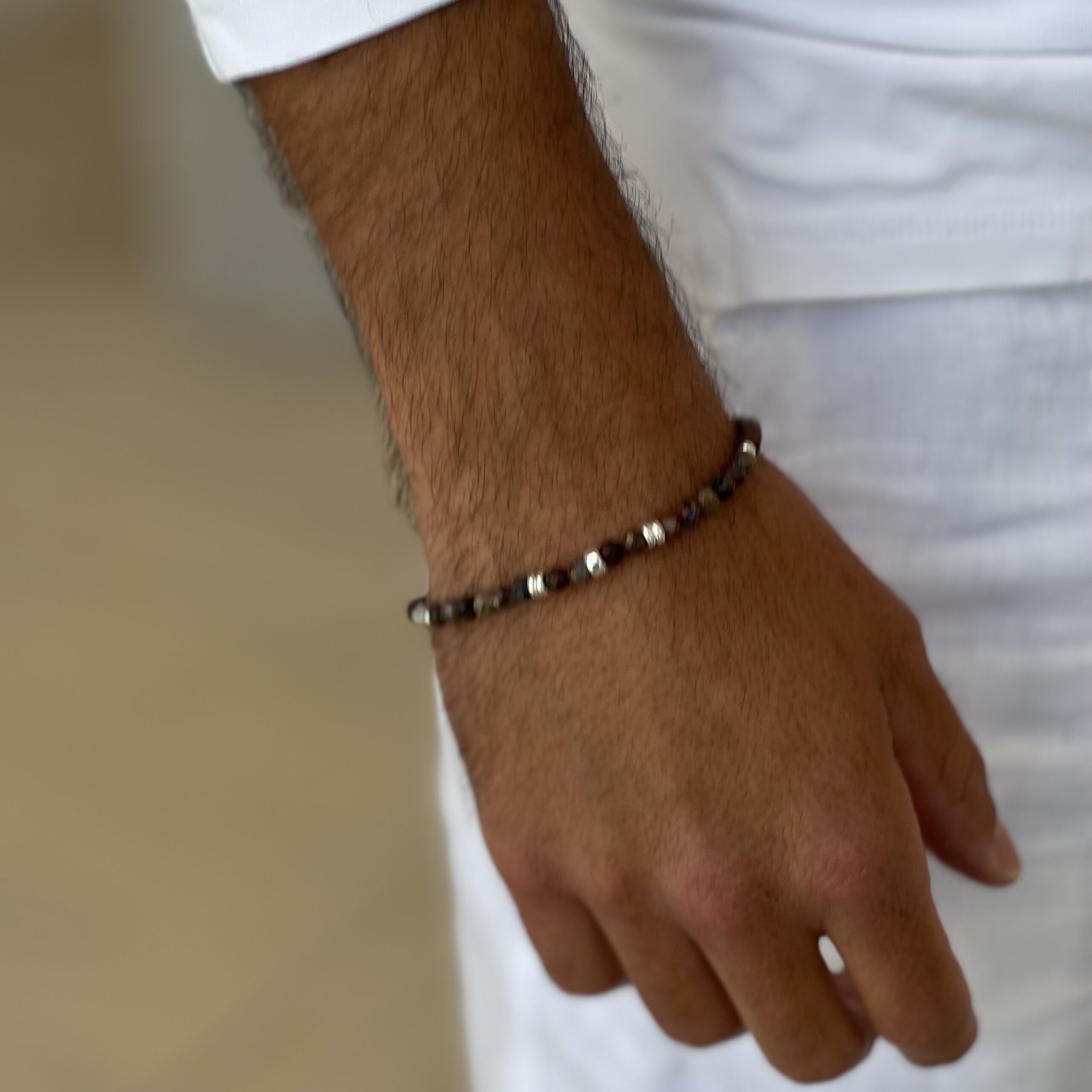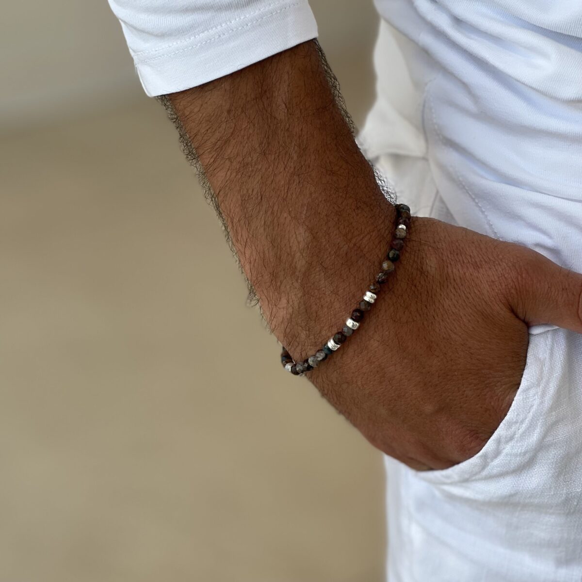 צמיד לגבר עשוי מאבני פטרסייט טבעיות בגוונים של חום וכחול כהה.
